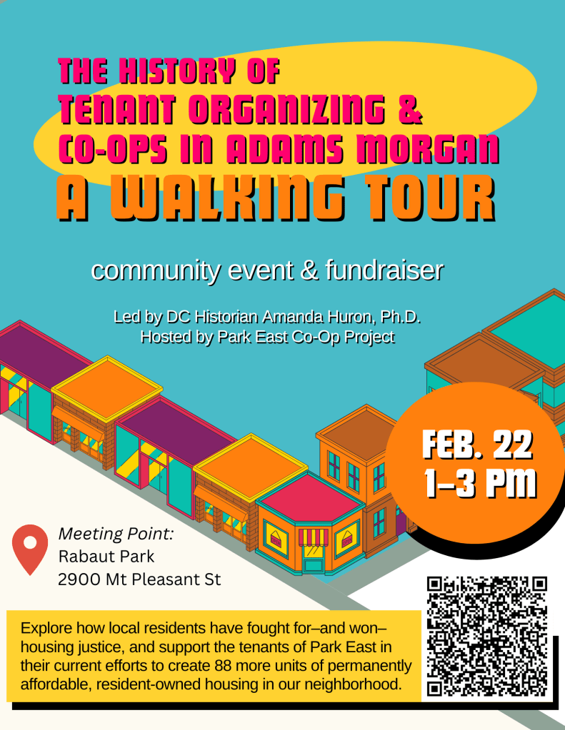 From the Park East Tenant Association: Want to learn more about the rich history of tenant organizing and co-operative housing in Adams Morgan, DC? Join our community walking tour and fundraiser to explore the past and present of housing justice and co-operative homeownership in our neighborhood!