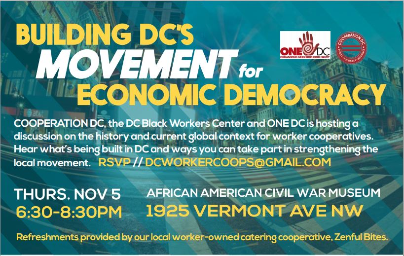 On Thursday November 5th from 6:30-8:30pm, there will be a community event where we’ll hear from our new and existing coops, make the connection with the national movement, and share ways everyone can support economic democracy in DC. Please RSVP here and spread the word!