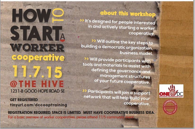 A group of us — Jennifer Bryant, Eva Seidelman, Tracy McCurty, Adwoa Masozi, Silvia Salazar, Melody Webb, and a few others — have been meeting over the last year to create a worker cooperative incubator called Cooperation DC. It will be housed in and fiscally sponsored by ONE DC, and will kick off with a training in November.